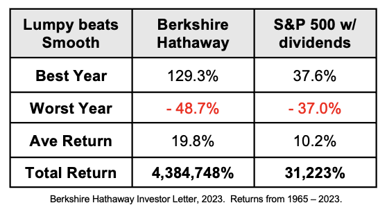 Warren Buffett, “Charlie and I would much rather earn a lumpy 15% over time than a smooth 12%.”